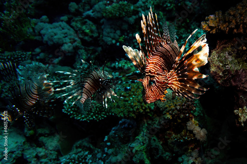 Red lionfishes over a blue coral reef background