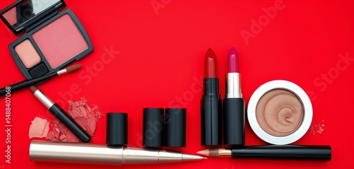 Red lipstick, eyeshadow, mascara arranged artfully on bold red background, glam, dramatic