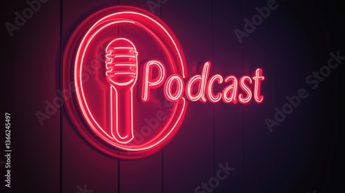 Red neon sign with a microphone and the word Podcast glowing on a dark wall.