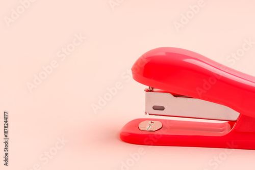 Red office stapler on light pink background