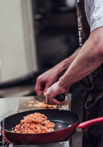Red Pan with Pile of Cut Salmon Pieces in the Foreground, Male Chef Cutting Fresh Salmon on the Wooden Board in the Background - Isolated Action with Only Hands Showing, Kitchen Set