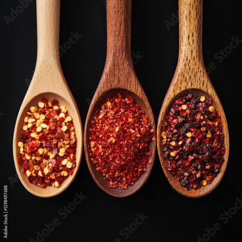 spice, seasoning, condiment, ingredient, cooking, food, favor, hot, spicey, wooden spoon, spoon, kitchen, macro, closeup, texture, detail, background, black background, overhead, topview, dry, receipe, culinary, aromatic, flavouring