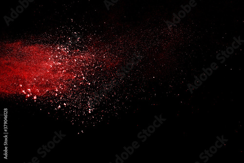 Red powder explosion on black background. Paint Holi.