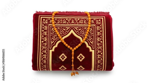 Red prayer mat with amber tasbih on white | Ramadan, Eid, Prayer, Mat, Tasbih, Islamic, Worship.