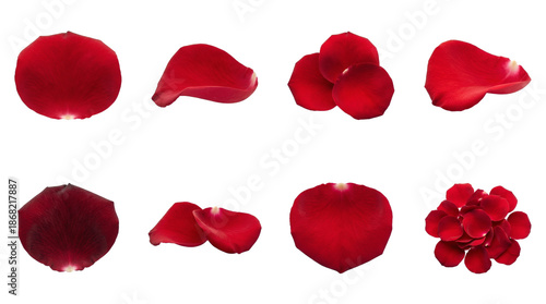 Red rose petal set including single, layered, grouped, and heart shaped arrangements isolated. Romantic floral collection for wedding and valentines day decor.