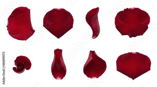 Red rose petals set including curved, curled, flat, and folded variants isolated. Romantic floral elements for wedding and valentines design.