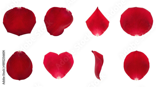 Red rose petals set including various shapes, heart, side view, and curved positions isolated. Romantic floral collection for wedding and valentines day.