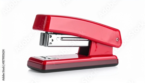 stapler, red, office, supply, stationery, desk, tool, metallic, mechanism, tray, footed, handle, press, bind, paper, sheet, fastener, compact, functional, everyday, essential, classic, hard-wearing, sturdy, bright, striking, bold, practical, organised, neat, accessory, equipment, school, workplace, utility, hand-held, crafted, modern, simple, efficient, accurateness, common, object, visible