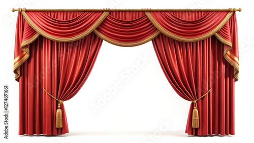 curtain, red, velvet, drapery, stage, theatre, fabric, textile, background, white, isolated, object, design, element, decoration, interior, luxury, classic, elegant, rich, opulent, fold, pleat, tassel, trim, gold, maroon, crimson, window, treatment, hanging, scene, setting, studio, photo, image, visual, presentation, composition, texture, material