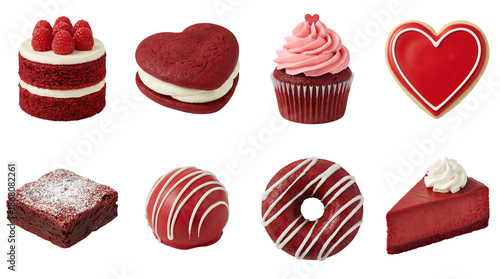 Red velvet dessert set including cake, whoopie pie, cupcake, cookie, brownie, truffle, donut, and cheesecake isolated. Romantic Valentine sweets collection.