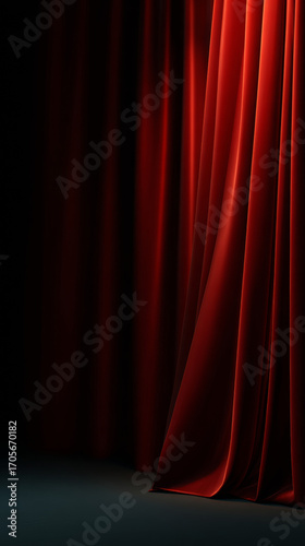 Red velvet theater curtains draped on dark stage with dramatic lighting, elegant theatrical performance backdrop with luxurious fabric drapes, classic opera house or cinema curtain design