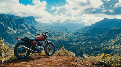 Red vintage motorcycle on a cliffside overlooking vast green valley landscapes