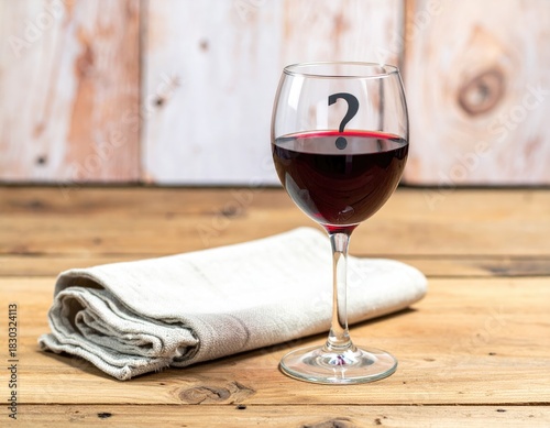 Red wine glass, question mark, cloth. Rustic wood backdrop