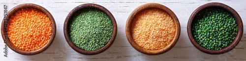 Red, Yellow, and Green Lentils in Wooden Bowls on a Rustic White Background, Top View