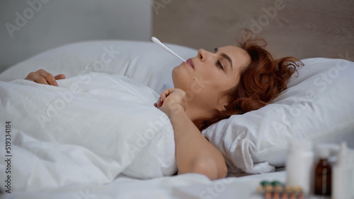 redhead and sick woman measuring temperature with electronic thermometer and lying on bed.