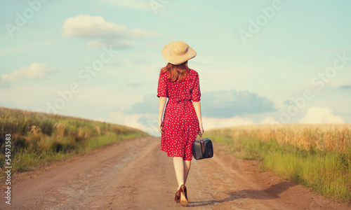 Redhead girl with suitcase at outdoor.