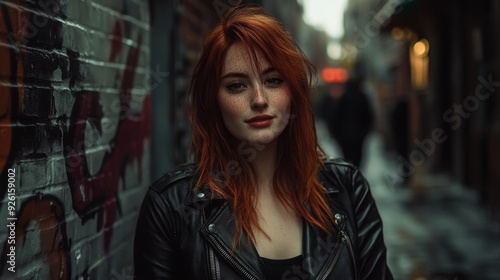 woman, redhead, girl, portrait, female, model, leather, jacket, street, urban, city, brick, wall, graffiti, background, fashion, style, pose, look, eye, hair, red, freckle, smile, clothing, casual attire, cool, attractive, beautiful, posing, standing, outside, daytime, dark, shadow, light, grey, sharpened, colours, photo, artistic
