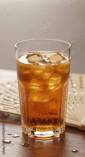 Refreshing amber beverage filled with ice cubes sits on a wooden surface beside a folding fan
