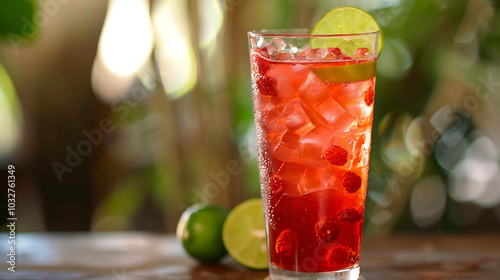 Refreshing and delicious raspberry lemonade with ice in a tall glass. The perfect drink for a hot summer day.