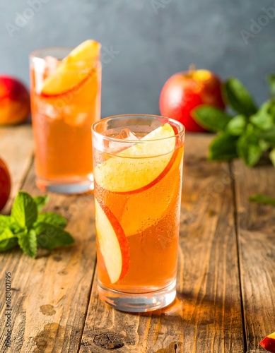drink, apple, iced, refreshing, fruit, cocktail, summer, autumn, slice, mint, ice, glasses, wooden, table, colourful, healthy, delicious, orange, transparent, light, fresh, cold, autumn, vibrant, juicy, tart, beverage