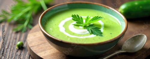 Refreshing chilled cucumber soup in a bowl, garnished with fresh dill and a swirl of yogurt Perfect for a hot summer day Ideal for light lunch or a healthy snack , cuisine, meal, yogurt