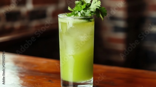 Refreshing Cilantro Cocktail: A vibrant green beverage in a tall glass, garnished with fresh cilantro, perfect for a summer evening.