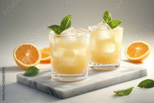 Refreshing citrus cocktail with ice cubes and fresh mint leaves, served in elegant glasses on a marble board, surrounded by juicy orange slices