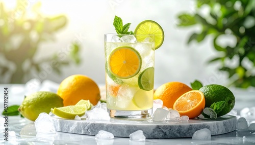 citrous, cooler, drink, ice, refreshment, glasses, lime, orange, mint, beverage, fruit, slice, sparkling, cold, marble, tray, garnish, summer, background, white, table, freshness, juicy, healthy, liquid, wet, sunshine, food, green, yellow, clear, bubble, cocktail, iced, sweet, sour, zest, refreshing, plant, ice cube, tableware, still life, closeup, indoor, decoration, natural