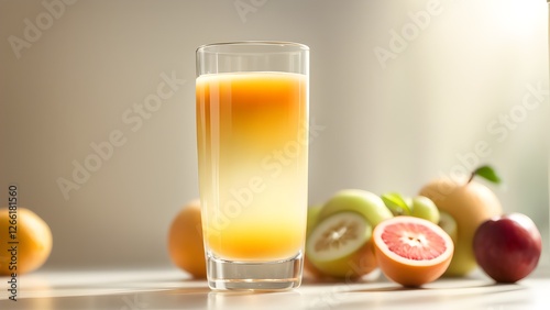 Refreshing citrus juice in a glass, surrounded by a variety of fresh fruits.