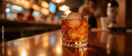 Refreshing cocktail served in stylish glass, featuring large ice cube, set against warm bar atmosphere