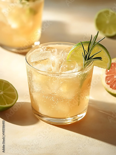 Refreshing cocktail with lime and rosemary garnish ice bubbles and citrus elements creating a summery scene.