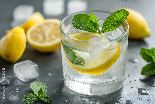 drink, beverage, refreshment, lemon, mint, ice, glasses, clear, liquid, yellow, green, fresh, citrous, herb, cool, summer, healthy, natural, water, soda, cocktail, garnish, condensation, droplet, dark
