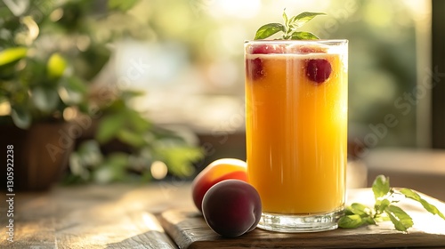 Refreshing Fruit Drink with Peach and Plum on Wooden Surface