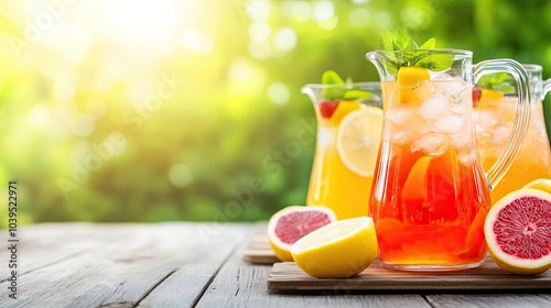 Refreshing fruit drinks in glass pitchers on a wooden table, natural sunlight setting.