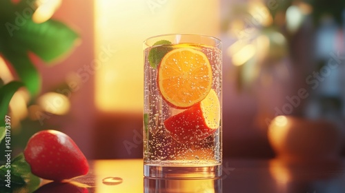 Refreshing fruit infused water drink in a glass, with orange and strawberry slices and mint