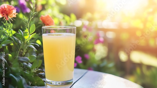 Refreshing glass of grapefruit juice on a sunny patio table surrounded by vibrant flowers and greenery perfect for a summer brunch