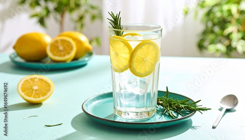 Refreshing glass of lemon and rosemary infused water for a healthy detox on a bright sunny day