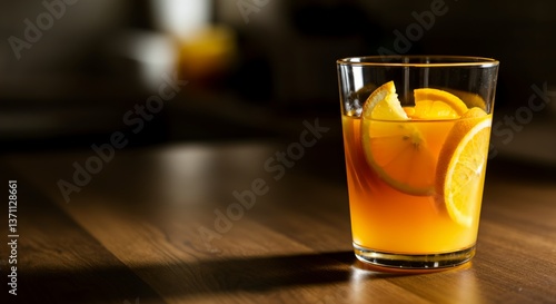 Refreshing glass of orange juice with slices on wooden table in sunlight
