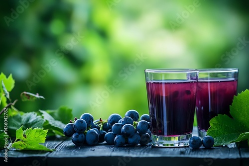 Refreshing Grape Juice in Glasses with Grapes and Green Leaves on Black Wood