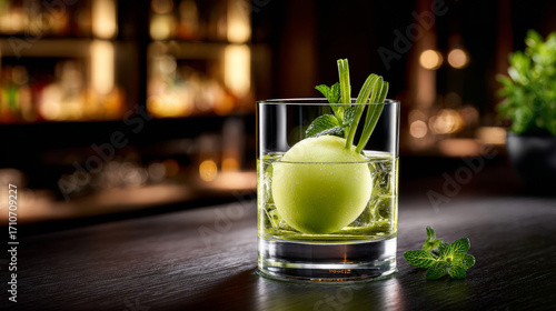 Refreshing green apple cocktail with fresh mint leaves and cucumber garnish in crystal rocks glass on dark wooden bar counter with blurred background.