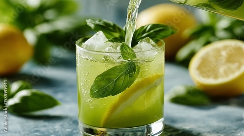 Refreshing Green Basil Lemonade Being Poured Into Glass with Fresh Basil Leaves and Lemon Slices