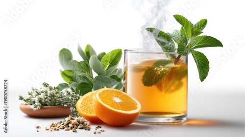 Refreshing Herbal Elixir: A vibrant and inviting scene showcasing a glass of steaming herbal tea, adorned with fresh mint and accompanied by sliced oranges and various herbs.