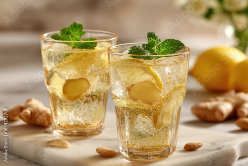 Refreshing homemade ginger ale in glasses with lemon slices and mint, served on a marble board with fresh ginger and almonds for a natural, healthy beverage option.