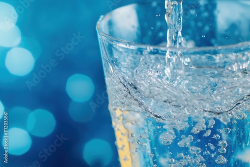 Refreshing hydration close-up action of water being poured into a glass bright blue background high-definition content inviting atmosphere concept of wellness and hydration awareness