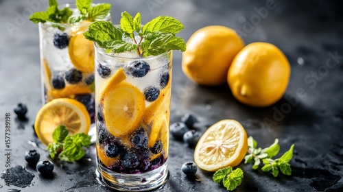blueberry, lemonade, iced, tall, glasses, mint, lemon, fresh, drink, summer, beverage, fruit, cool, refreshing, natural, sweet, sour, garnish, cocktail, party, bar, garden, picnic, decoration, hydratation, vibrant, colourful, taste, refreshment, juicy, cookery, ingredient, health, organic, artisan, receipe, glassware, food, aesthetic, composition, closeup, photo, decor, culinary, beauty