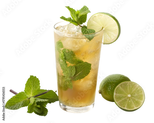 Refreshing iced drink with mint leaves and lime slice served on a transparent background