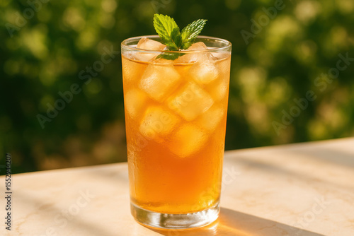 Refreshing iced tea glass with mint garnish sitting on sunny marble surface, cool drink perfect for summer outdoor enjoyment