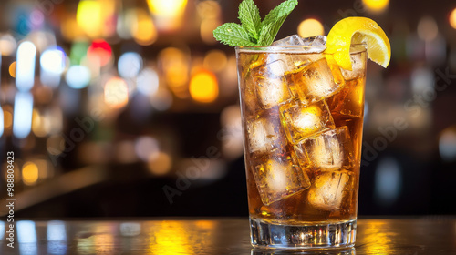 Refreshing iced tea in a glass garnished with a lemon slice and mint leaves on a blurred bar background