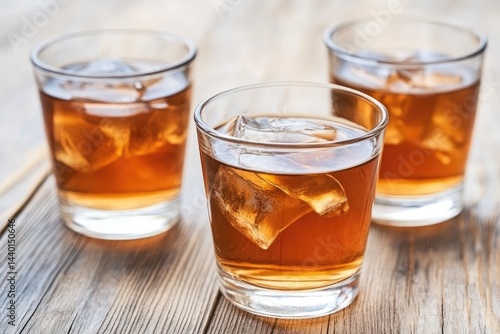 iced tea, tea, drink, beverage, summer, refreshment, glasses, cold, ice cube, clear, transparent, liquid, brown, amber, chilled, cool, refreshing, still life, indoor, wood, tabletop, closeup, group, trio, three, alcohol, cocktail, bourbon, whiskey, rum, mixer, party, social gathering, casual attire, tumbler, ice, cube, no people, nobody, studio shot, delicious, tasty