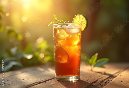 Refreshing iced tea with lemon and mint in glass, illuminated by sunlight, evokes sense of relaxation and summer vibes. Perfect for warm days